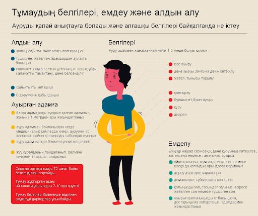 Тұмау басталғанда адамның денесі дел-сал болып, көңіл-күйі нашарлайды және тағамға тәбеті шаппайды. Бір-екі күннен кейін дене қызуы көтеріледі, басы ауырады, бұлшық еттері сыздап, буын-буыны сырқырайды, мұрны бітеді, дауысы қарлығып, жөтеледі, тамағы қызарып, жұтынғанда ауырады, көзі қызарып жасаурайды. Адам дереу дәрігерге көрініп, емделсе, үш-бес күннен кейін дене қызу төмендеп, сауыға бастайды.