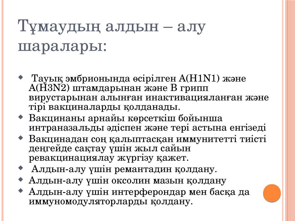 Тұмауға нақтылы диагноз қойып, науқасты оқшаулап, ауруханаларда не басқа тиісті мекемелерде карантин жарияланады. Тұмауға қарсы вакцина егіледі, оның ішіндегі ең тиімдісі – тазартылған вириондық вакцина. Алдын ала организмді шынықтыратын емдер жасап, спортпен шұғылданған дұрыс.
