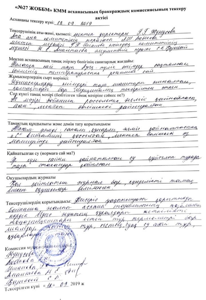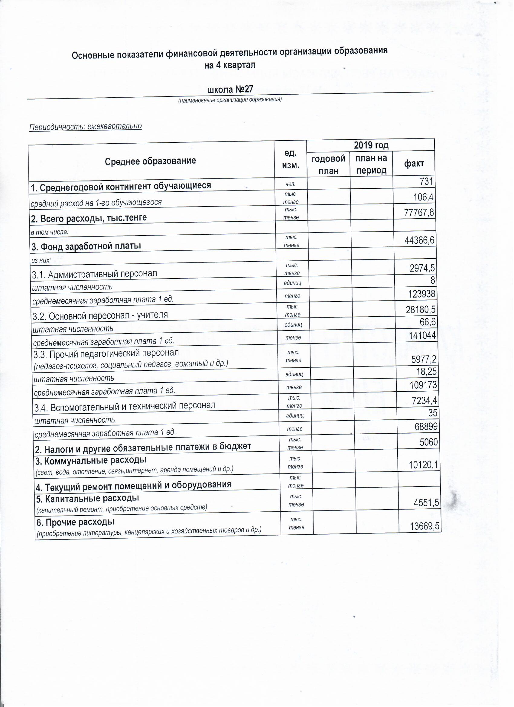 Мектеп директоры Г.Г.Жунусова ұжымды 2020 жылдың 1 қаңтары бойынша «№27 ЖОББМ» КММ-нің штат кестесімен таныстырды. (Штат саны 73,25 бірлік айлық еңбек қоры 5 613 509 тг)