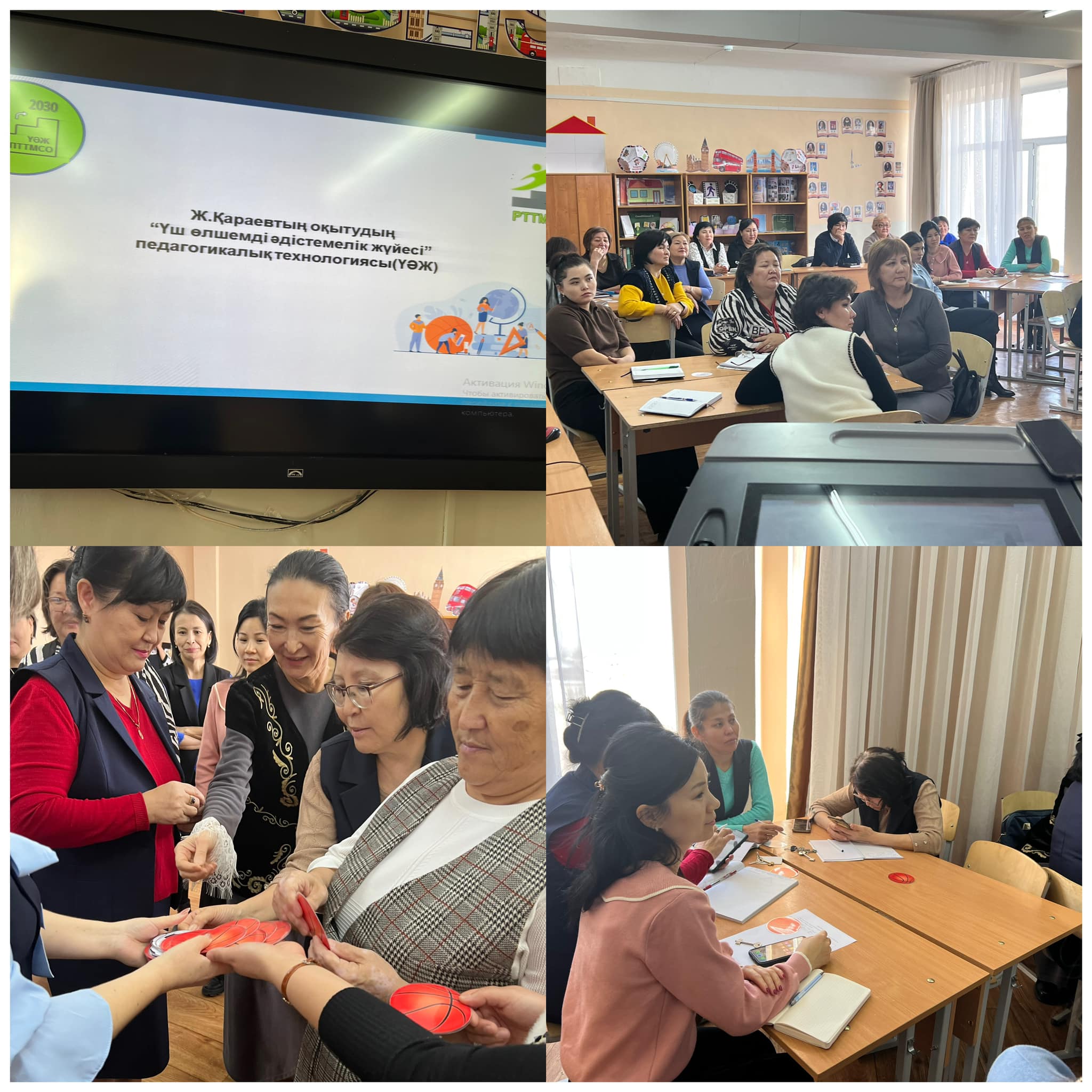 Оқытудың «Үшөлшемді әдістемелік жүйесі» педагогикалық технологиясының мәні. (Ж.А.Караевтың технологиясы бойынша) мектебімізде педагогтерге арналған әдістемелік семинар өтті. Семинарды директордың оқу ісі жөніндегі орынбасары А.А.Тажибаева жүргізді. Семинар мақсаты: ҮӘЖ технологиясы бойынша түсіндірме жұмыс жүргізу. Педагогтерге осы технологияны сабақта қалай қолдану керектігі жайлы ақпараттандырылды. Семинар барысында педагогтерге ашық журнал, деңгейлік тапсырмалардың құрылымы, білім сапасына оң әсерін беру жағы айтылып, педагогтер тарапынан кері байланыс жасалды.